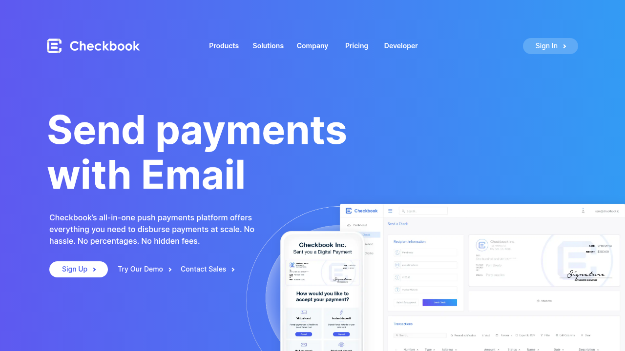 Checkbook offers a developer-friendly API for sending digital checks and ACH payments, positioning itself as a simple alternative to traditional payment processors. The platform provides straightforward REST API endpoints for creating and sending payments, with webhook support for tracking payment status. You can trigger payouts programmatically and give payees the option to receive funds via digital check, ACH transfer, or physical check.