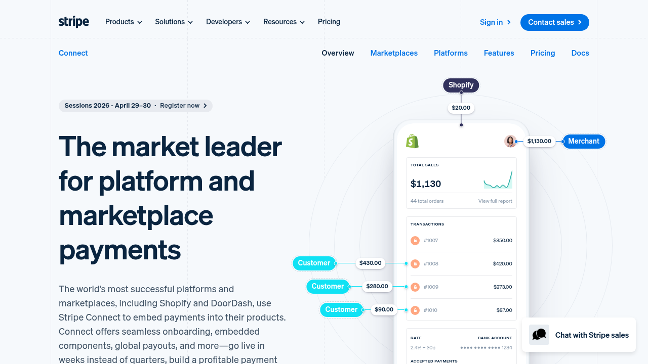 The platform supports payments in 135+ currencies and more than 40 payment methods. You can route funds between multiple parties using destination charges, direct charges, or separate charges and transfers. Built-in capabilities include fraud detection, automated 1099 tax reporting, configurable payout schedules, and optional instant payouts to bank accounts or debit cards.