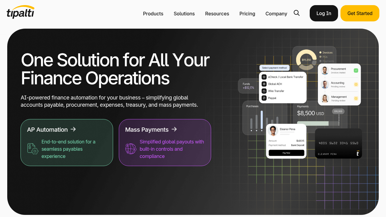 Tipalti provides mass payout infrastructure with global payment coverage and tax compliance automation for finance teams executing high-volume disbursements.